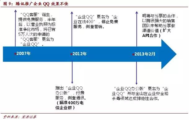 2007年,“QQ客服”诞生,半年多后,这个免费产品有了5万人次的申请。而到2013年2月更名为“企业QQ”的“企业QQ办公版”的经过了6年的积累企业用户也只有30万,与其在消费互联网领域的地位相差甚远。
