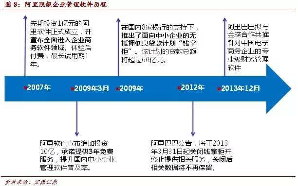 阿里巴巴在企业软件市场开拓受挫,最终选择与软件商合作。2013年12月,阿里巴巴拟与金蝶合作共推针对中国电子商务企业的专业级财务管理软件。