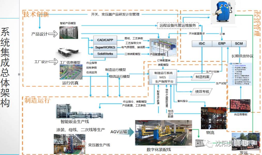 在智能制造理论框架体系的指导下,基于先进的智能制造技术,以信息基础设施和智能化装备为基础,以智能工厂制造运行系统(MES)为大脑和运行管控中枢,与企业上层的企业资源计划管理ERP、产品全生命周期管理PLM实现纵向集成;以产品的数字化研发设计,产品个性化定制平台,产品数据管理(PDM),到生产制造再到运维服务的横向集成,以及以供应链管理、质量管理为基础的端到端集成,最终建成中压变电及储能设备智能工厂