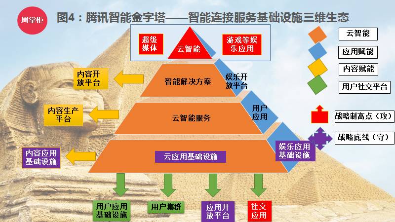 而腾讯的变化更加深刻。腾讯在QQ时代的流量贩卖形态也是非常简单直接的,但是微信时代腾讯也开始逐渐通过开放下沉为基础设施,如图4中腾讯的智能金字塔,信息通讯、应用赋能、内容赋能、社交平台四个维度,都有清晰的战略制高点和战略底线。在“智能连接”服务上,微信的“实验室”、“小程序”和“搜索”都非常具有进攻性,“内容应用基础设施”、“通讯应用基础设施”、“娱乐应用基础设施”和“用户应用基础设施”四个大的战略布局和板块,已经把腾讯的“竞争塑造”机制做牢。现在已经很难说哪一个公司是腾讯的敌人,因为腾讯几乎为所有公司和行业赋能,正在努力追求立于不败之地。