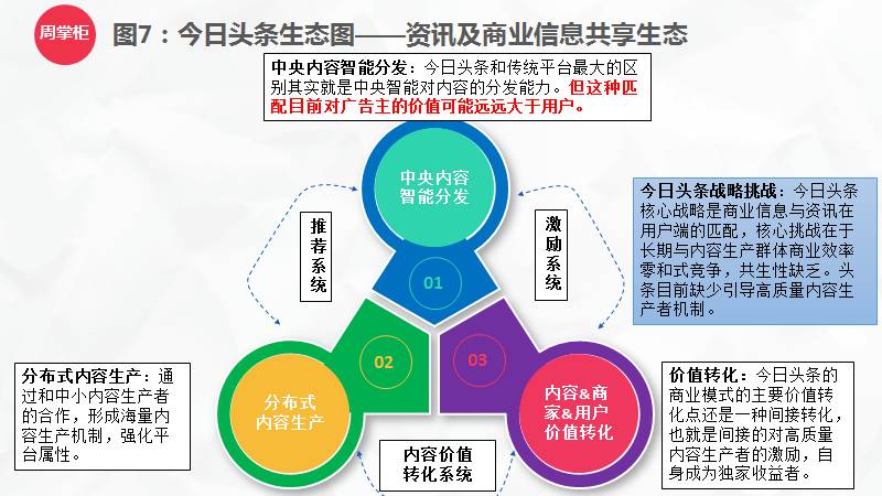 如图7,今日头条战略挑战非常明显。今日头条核心战略是商业信息与资讯在用户端的匹配,核心挑战在于长期与内容生产群体商业效率零和式竞争,共生性缺乏。头条目前缺少引导高质量内容生产者机制。举一个例子就是:今日头条的内生态还不能让高质量内容生产者做大做强并加大投入,还处于广泛掠夺内容生产者的阶段。