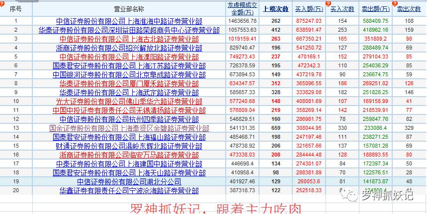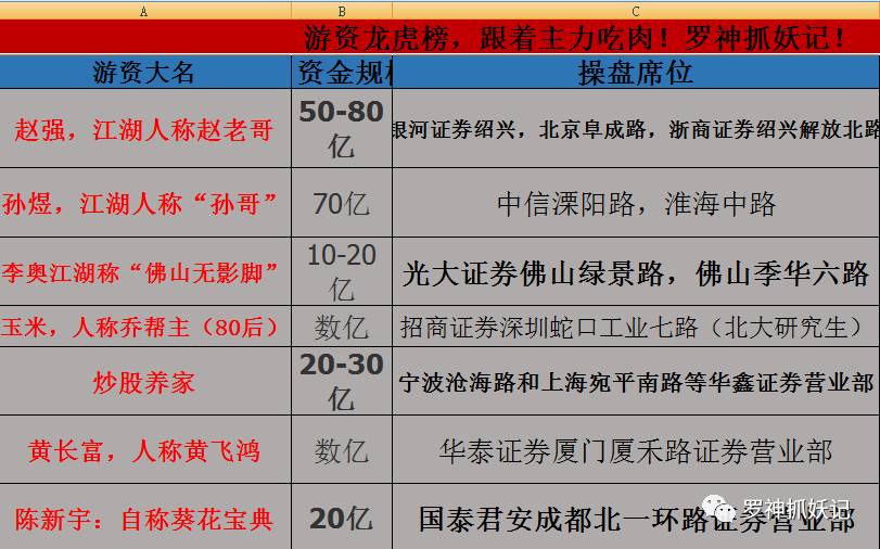 如新进入的新秀赵老哥御用中信证券上海古北路、浙商证券绍兴解放北路、银河证券北京阜成路和佛山帮的光大证券股份有限公司佛山绿景路,前期老派很活跃的著名的游资国信泰然九路营业部,国信上海北京东路营业部 ,国信广州东风中路营业部,光大证券宁波解放南路营业部 和国泰君安深圳益田路营业部。