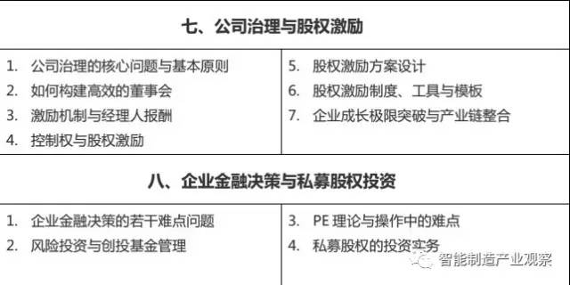 课程汇集了国内最优秀的专家教授、行业领袖,通过全角度的课题设计,帮助企业更好的实现转型升级与接轨工业4.0,通过产业与金融资本的对接,让企业更好的创新、创造价值。通过国内体验之旅与国外深度考察,帮助学员企业建立全球化的视野。