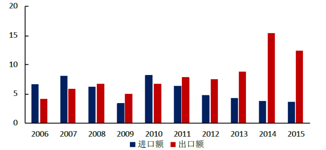2006-2015年中国木工机械进出口情况(亿美元)