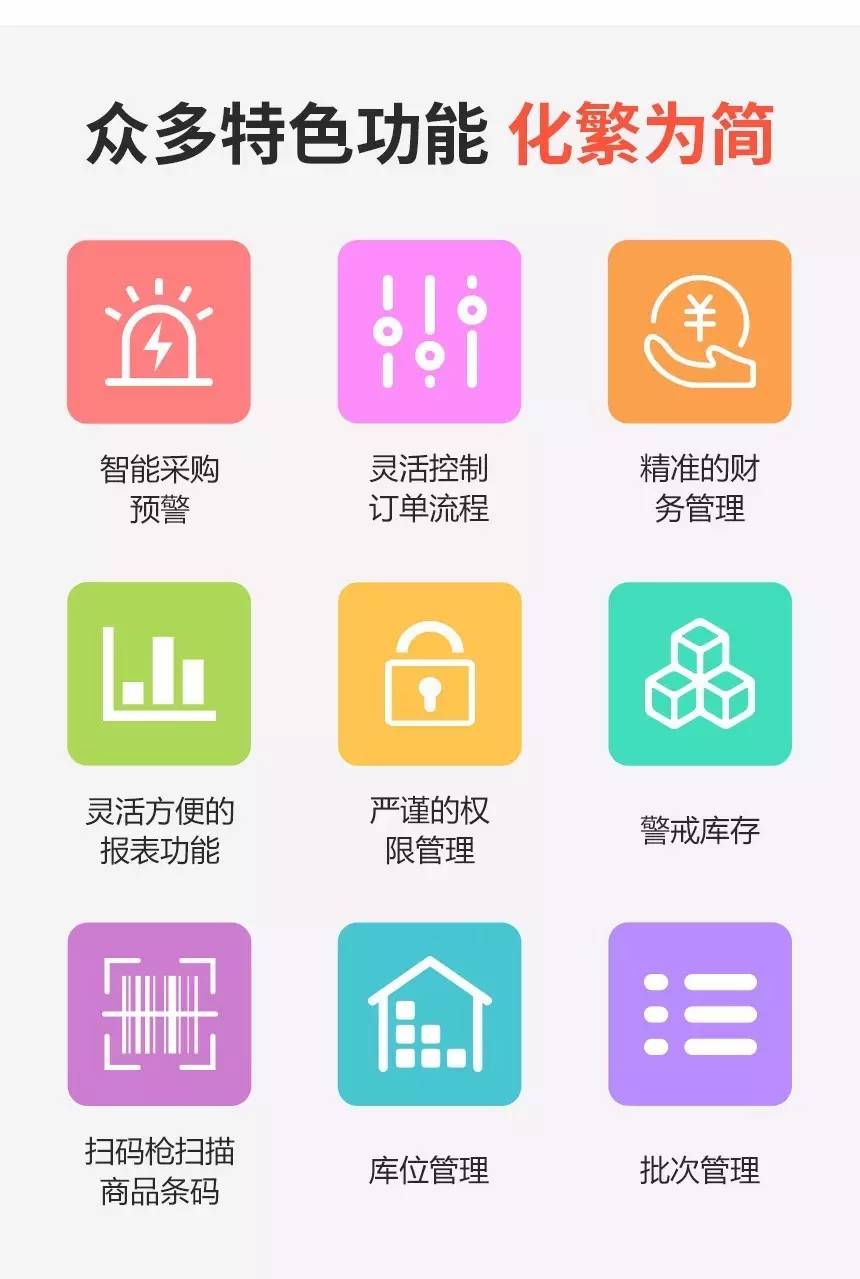 功能上囊括了商品管理、采购管理、库存管理、订单管理、财务管理、会员管理、报表统计、用户管理等主要模块。