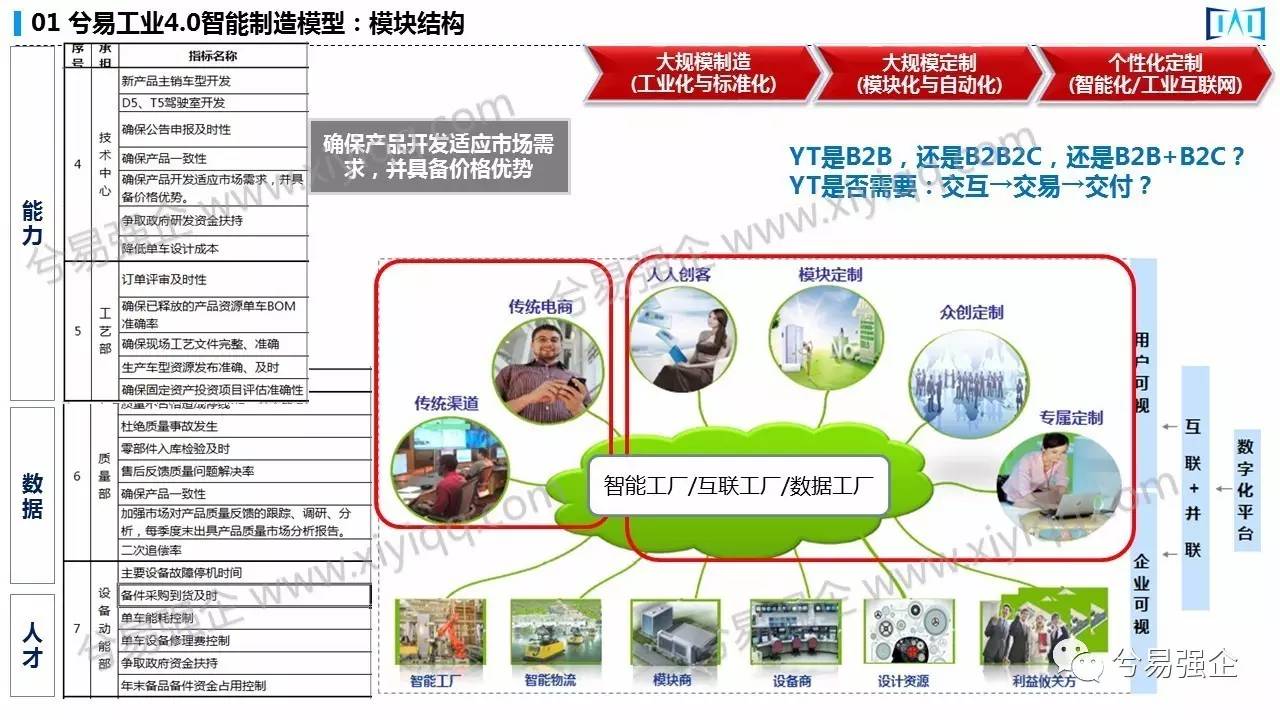 左边就是一家汽车企业的KPI,汽车工业KPI在整个技术中心里面的第四个,第五个KPI,就是确保产品开发,适应市场需求,并具备价格优势。那么这个KPI在未来的形态有可能是这样:你怎么确保你的产品开发适合市场需求,如何和市场用户的需求进行直接勾连,现在我们是不相连的,产品研发都属于滞后状态,我们没有平台,没有工具,没有组织,没有流程,也没有系统相连,这个就是给大家举一个例子了。这个里面传统电商和传统渠道,在2.0之前就可以做到,而这些人人创客,规模化,模块化定制的订单,众创的定制和模块的定制,就是未来2.0到3.0,3.0到4.0的才能达到的。