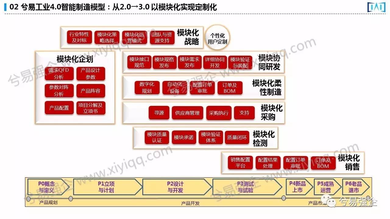 二、从2.0到3.0以模块化实现定制化我越来越坚信,2.0到3.0本质特征是大规模定制,我不太相信能从标准化的大订单完全过渡到完全个性化的订单,你想象不出来该怎么过渡,你的标准化平台化,模块化都没做好怎么才能过渡到一个完全个性化的订单呢?你的产业怎么去适应呢?所以中间的过渡性呢?