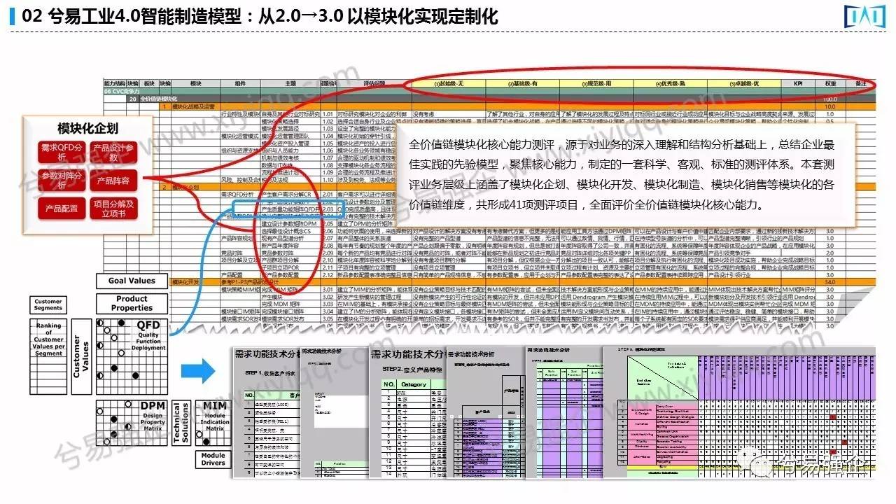 在模块化结构方面,首先是你对于企业来说有没有模块化的战略,模块化的战略有四个组件来考评。那么你的行业特殊性的对标模块化战略的选择、模块化的运营模式、团队和资源的支持你有没有;在产品的企划设计上,你有没有模块化的企划,你有模块化的企划,我们就来测试,你有没有追求QFD的分析、产品设计参数、产品阵容、产品对比管理有没有项目分解;在模块化研发、模块的柔性制造、模块化的采购、模块化销售等方面都有着不同的标准。
