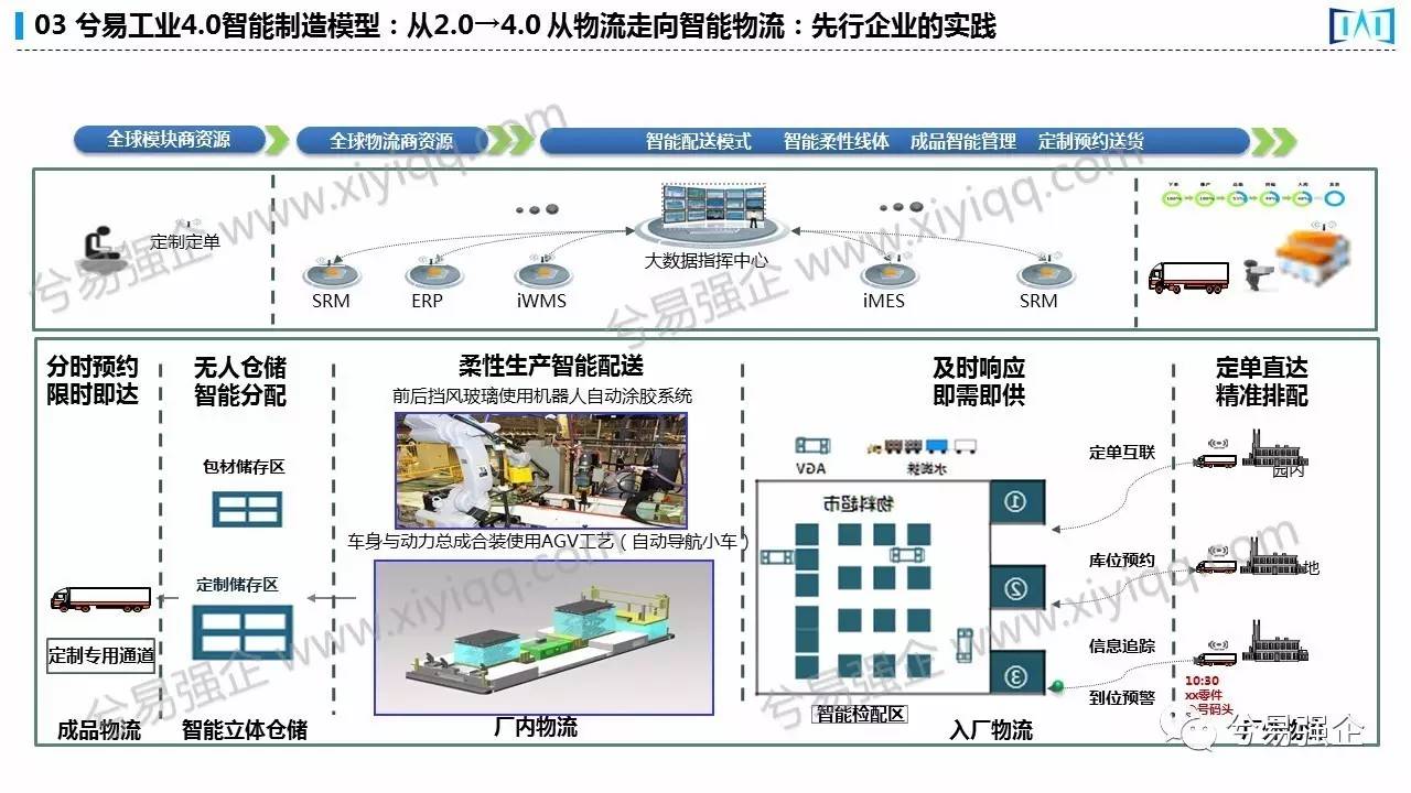 下面的厂间物流AGV小车全部的零部件统一加载汇总,车身与动力总成合装使用AGV工艺,这个先进在AGV本身作为了一道工序,移动式工序,然后再到总装再到无人仓自动分配,再到outbound的厂外物流。而在上面是涉及到的iMES也好,IWMS仓库管理系统,最后再用大数据作为跟进,然后这个更先进的一点是自动物流走向数据物流,这是一个大数据的概念。这套物流体系已经部分实践落地了。