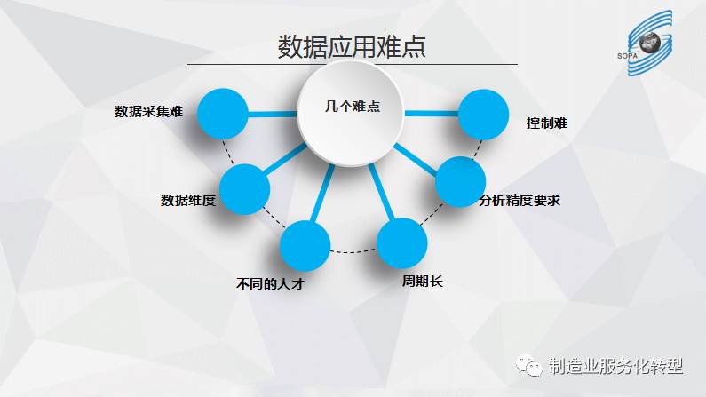 1数据采集难:工业数据想要采集,本身就具备相当的难度,有些难度是由于历史原因,未来也许不难,比如设备的通讯接口,通讯协议,协议点表,是否需要新增传感器,传感器的性能是否能够满足业务需求。另外一些是业务难度,也就是说需要很多的隐性知识才能把数据采集上来,比如传感器的位置(都是压力传感器应该装在哪里),采集的周期如何设定等等。针对数据的采集,我等下再和大家分享一下。