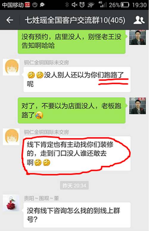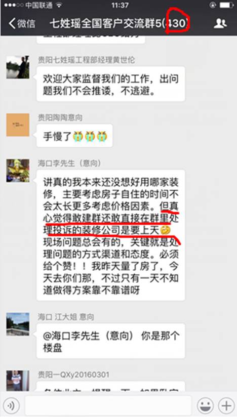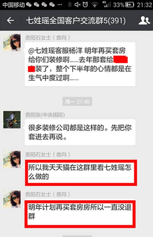 正如下面这位客户,即使2016年被其它一个大公司忽悠了,上套了,但仍不愿意退出“七姓瑶客户群”,“猫在群里”,明年买房一定交给七姓瑶,就是对这种透明装修模式的挚爱。