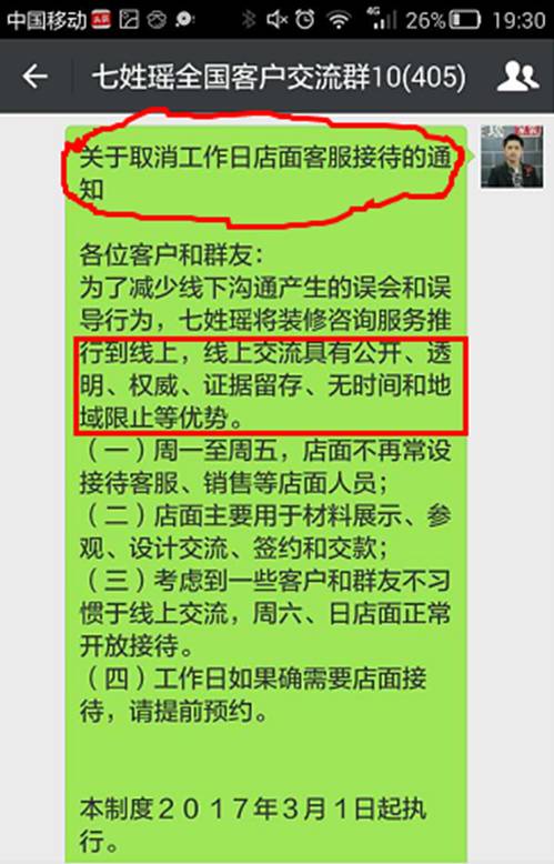 原来2月28日,七姓瑶家装公司在10大全国客户群(近5000客户)颁布了一项史无前例的制度,即“关于取消工作日店面客服接待的通知”(见下图)。