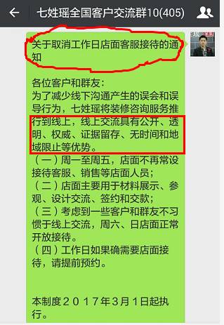 原来2月28日,七姓瑶家装公司在 10 大全国客户群(近 5000 客户)颁布了一项史无前例的制度,即“关于取消工作日店面客服接待的通知”(见下图)。