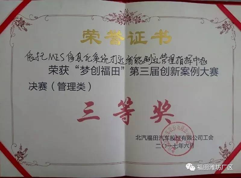 近日,山东多功能工厂推选的利用MES信息化系统打造智能制造管控指挥中枢项目,在参加集团公司第三届梦创福田创新案例大赛中脱颖而出,在19个管理类项目中一举夺得本次大赛的三等奖,工厂工会为做好本次比赛的参加,先期在工厂组织开展了工厂级创新项目的初赛,来自工厂八个分会的八个项目经过评审组的评审,推选出了2个技术创新类、2个管理类项目参加集团公司的复赛,共有来自集团公司19个事业部44个项目进入复赛,其中技术创新类25个,管理创新类19个,每个类别的项目取前六分属一、二、三等奖,经过专业评审组两轮的现场答辩评定,工厂推选的MES信息化系统入围大赛决赛并获三等奖,项目主要是依托公司提出的工业4.0战略规划,结合目前生产信息系统建设情况,为逐步实现工厂的网络化、数字化、智能化,对数字化深入应用方面进行了规划,对生产过程执行系统(MES系统)进行立项开发。