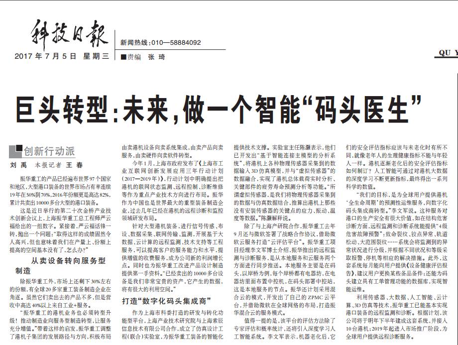 针对大型港机装备,进行信号传感、布设、数据采集、联网传输、监测,开展基于大数据、云计算的远程监测、技术支持等工程服务,可以提高客户的服务能力和水平,提供增值的收费服务,成为公司新的利润增长点。同时也为振华重工改进产品设计制造提供第一手资料。“已经卖出的10000多台设备是我们非常宝贵的资产,它产生的数据,将有很大的利用空间。”