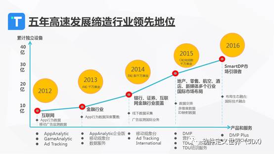 近五年的发展,TalkingData缔造了行业领先地位。2012年移动互联网行业方兴未艾,TalkingData顺应时代趋势,重磅推出App Analytics、Game Analytics、Ad Tracking等多款App行为数据监测产品。2013年公司涉足金融领域并实现App行为数据深度覆盖。2014年TalkingData继续深耕金融,银行、证券、互联网金融行业全覆盖,并开始线下数据采集和广告监测国际业务。2015年TalkingData继续扩大版图,在地产、零售、航空、酒店、新媒体多个行业以及国际市场布局。