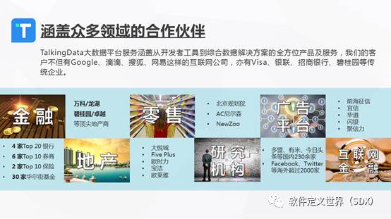 今天我们的百企系列为大家介绍的是一家大数据独角兽TalkingData,一家帮助传统企业转型升级为数据驱动型企业的公司。TalkingData最初为十余万app开发者提供app分析服务,在这个过程中积累了数十亿计的用户行为数据,并利用这些数据为金融、证券、保险、房地产、零售、航旅、汽车等行业客户打造智能数据平台SmartDP,SmartDP是DT时代企业信息化的核心平台,企业可以通过SmartDP可以有序存储、管理和应用数据,从而卓有成效地经营客户,挖据数据价值,提升核心竞争力。