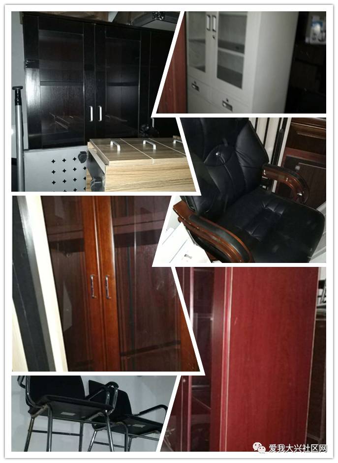 1.因公司库房到期,出售闲置办公家具,有工位十套;简单班台两套,含一个桌子一个三层抽屉小滑柜;大班台两套,含桌子和小柜;小圆玻璃茶几一套,配两把椅子高度可调,玻璃圆茶几一个,双开门木质立柜2个,三开门木质立柜2个,前台桌子一个,单人方沙发两个,四腿椅子40把,这些东西都是公司自己用的,有8成新。