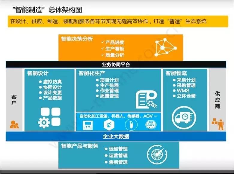这是我们为某世界500强企业做的一张规划图,简单的说,就是要打通设备端口与MES的链接,做到实时监控;打通MES与ERP的端口,做到真实的生产数据上传,并起到决策作用。同时,建立营销和设计的协同设计。现在增加了产品的智能化,卖出的产品要能及时反馈信息数据到公司的云。