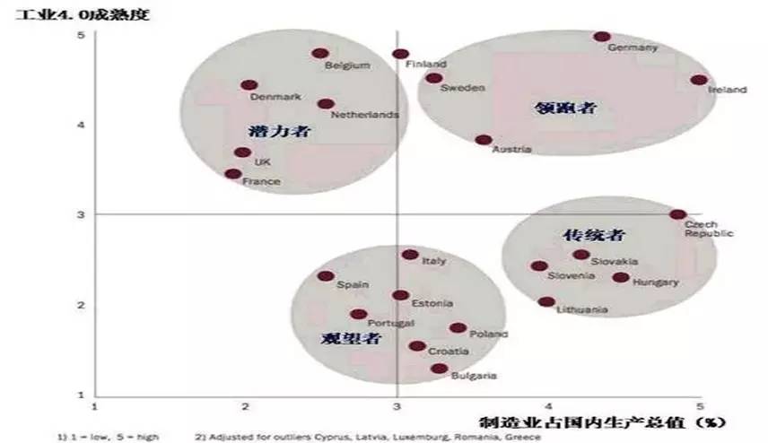 罗兰贝格根据工业4.0成熟度衡量指标,把欧盟主要制造国家根据其对于工业4.0成熟度和制造业占总产值程度划分为四类:1. 领跑者(Frontrunners):德国、瑞典、奥地利、爱尔兰;2. 潜力者(Potentialists):芬兰、比利时、丹麦、荷兰、英国、法国;3. 传统者(Traditionalists):捷克、斯洛伐克、波兰、保加利亚、意大利等;4. 观望者(Hesitators):西班牙、葡萄牙。
