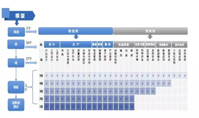 下图是中国新出的第一版——智能制造成熟度测评1.0模型。如果是制造型企业 可以测一测,我觉得对自己企业的认知会有好处。
