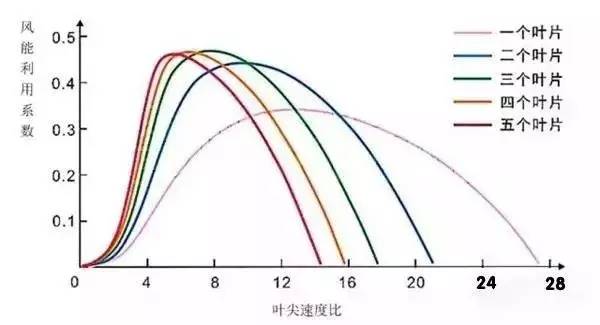 从上图看可以看出随着叶片数量的增加,风能利用的系数也在增加,但是在从3叶到4叶到5叶的过程中,风能利用系数增加的幅度,相比于1叶到2叶到3叶的增加的幅度要小很多,从成本角度讲,得不偿失。