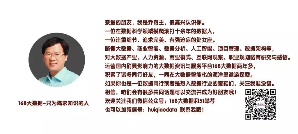 168大数据 www.bi168.cn 是国内最具影响力的大数据干货分享与产业服务平台,专注大数据、商业智能、数据分析、云计算、人工智能等数据科学领域的深度交流、知识分享、职场社交和职业发展,以大数据驱动创业创新和助力传统产业转型升级为使命,致力于为大数据产业的从业者、传统企业、厂商、服务商提供最具价值的资讯、服务、连接与智库研究。平台聚集了国内外近十万数据领域的大数据企业创始人、首席技术官、首席数据官、数据架构师、数据科学家、大数据工程师、BI工程师等精英人物,共同致力于大数据技术、大数据价值、大数据思维的传播、交流与分享。