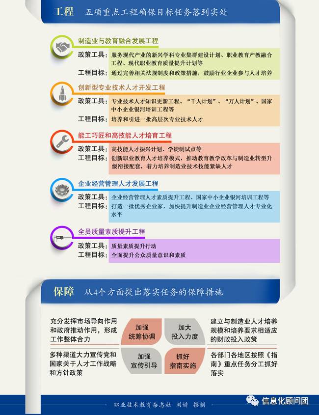 《制造业人才发展规划指南》在职业教育服务制造强国建设方面有几个方面亮点:一是强调同步发展,建立学科专业动态调整机制,根据制造流程变革改造升级传统学科专业。二是重视优化体系,强化了普通中小学职业培育观和在岗职工培训两方面内容。三是凸显工匠精神,把“大力培育工匠精神”列为“提升制造业人才关键能力和素质”主要任务之中。四是注重质量为先,把“提高全员质量素质”作为主要任务,鼓励制造业企业加大质量培训力度,在高等学校、职业学校加强质量相关学科专业建设等。