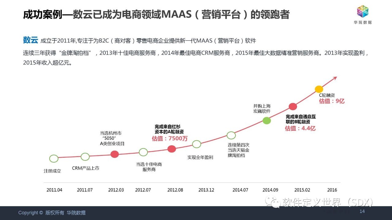 杭州数云信息技术有限公司,成立于2011年, 致力于为消费品牌和零售品牌商提供整合软件产品、数据模型和专业服务的一站式数据化营销解决方案; 数据化营销管理软件采用先进的技术架构,支持公有云SAAS和私有云独立部署模式;产品以CRM(客户关系管理)和BI(商业智能)为核心应用,并渗透到全渠道数据化营销、销售和服务各个接触点的价值闭环。