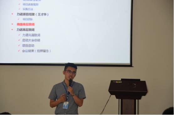 议程一:鼎捷软件项目实施团队项目经理潘誉向大家详细介绍了鼎捷项目团队和职责、项目进度规划及实施方案。