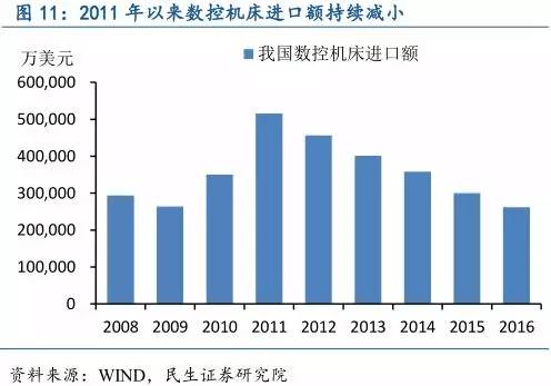 高端数控仍处于起步阶段。我国目前处于数控机床的智能化技术起步阶段,现阶段大部分的数控机床还不具备智能化功能,自主生产的数控机床主要以中低端产品为主,高端数控机床(数控系统)主要依靠进口,2016年我国数控机床进口额约26亿美元。