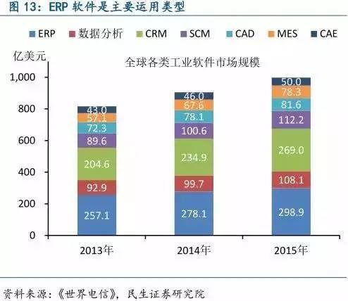 截止2015年全球MES软件的规模达到78亿美元,维持17%左右的高增长率。客户管理和供应链管理软件的高速增长也反映出制造企业顺应“网络化协同制造”的要求,更加重视与消费者和产业链的信息交流。