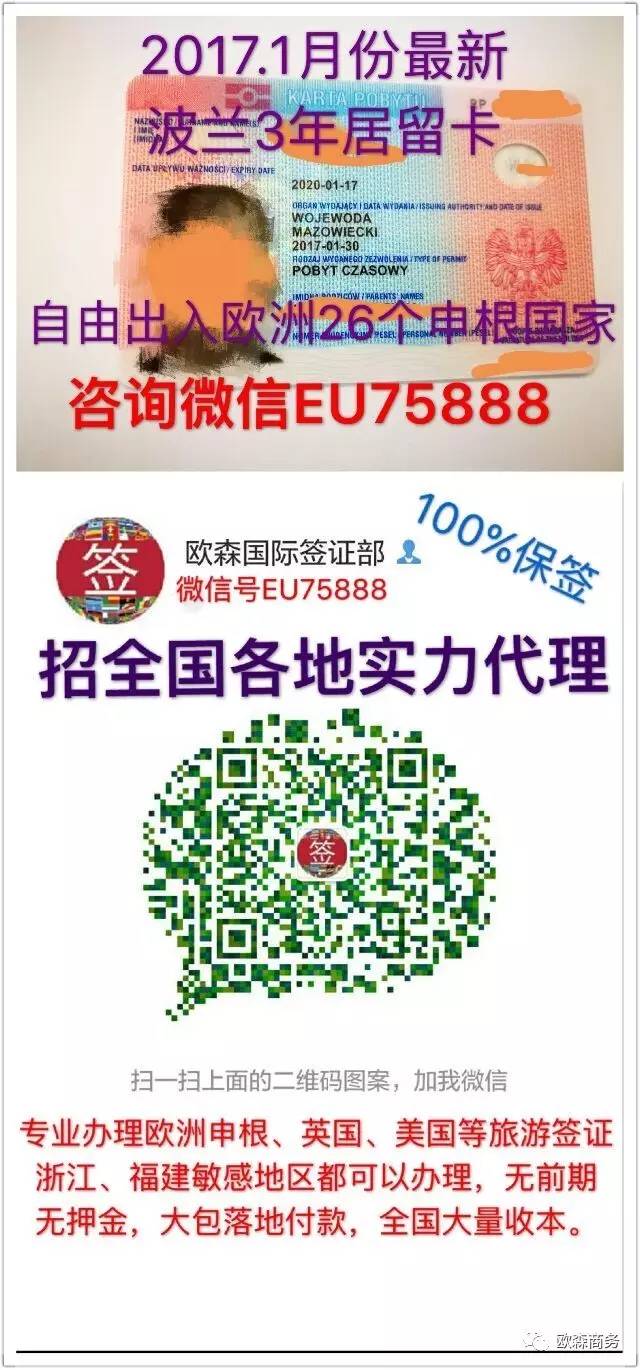 专业办理中国至欧洲所有国家一手签证,手续简单便捷,办理周日短,正规申根旅游签,前期无任何费用,无押金包机票,到达目的中国付款,拒签本、白本、滞留本福建,浙江,东北地区大量收客,出签率100%,别人办理不了的,我们都可以办理,全国各地的客户都可办理!此广告长年有效,有意者请联系微信781868370【好消息】办理波兰居留、