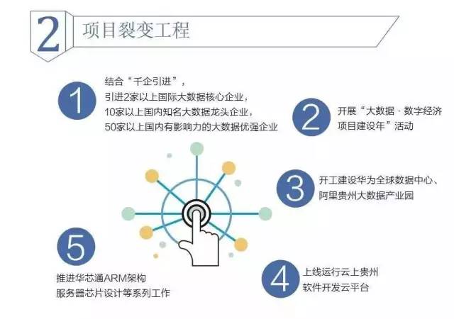 结合“千企引进”工程,引进2家以上国际大数据核心企业、10家以上国内知名大数据龙头企业、50家以上国内有影响力的大数据优强企业落地贵州。