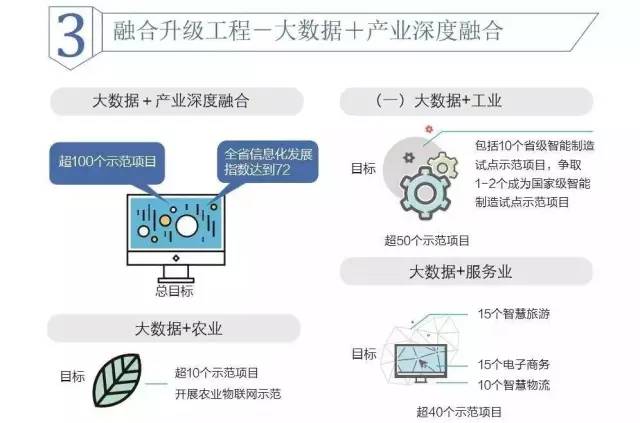 实施“大数据+产业深度融合行动计划”。引领全省各行各业转型升级提质增效发展,建设100个以上典型示范项目,引进扶持一批解决方案服务商。全省信息化发展指数达到72。其中: