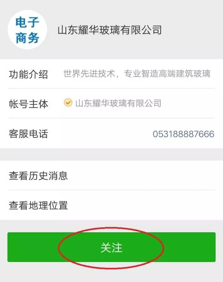 使用指南第一步:请关注“山东耀华玻璃有限公司”微信公众号,或长按下图二维码识别关注。
