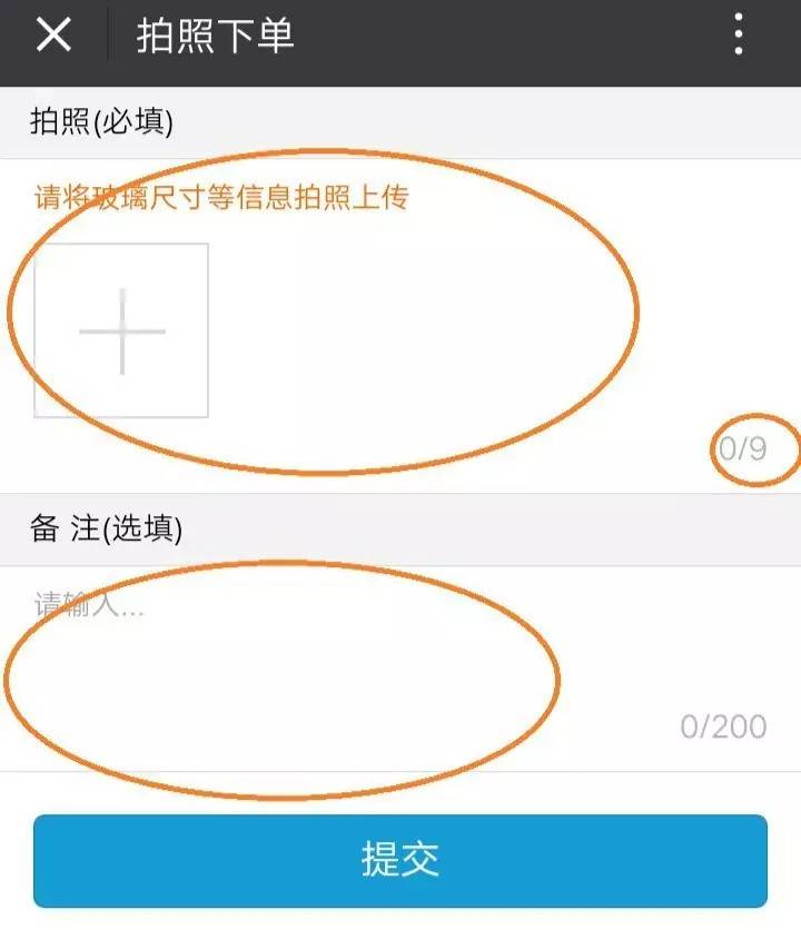 手机绑定成功后可进行拍照,上传订单规格、数量等信息,每次可上传9张图片,订单的其它特殊要求请在备注说明中。