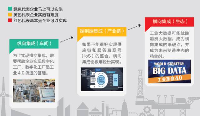 工业4.0将无处不在的传感器、嵌入式终端系统、智能控制系统、通信设施通过CPS形成一个智能网络,使人与人、人与机器、机器与机器以及服务与服务之间能够互联,从而实现横向、纵向和端对端的高度集成,集成是实现工业4.0的重点也是难点。