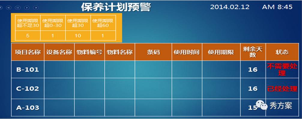 预警系统:安全库存预警、呆滞备品预警、A类备品寿命周期预警7.设备报表系统