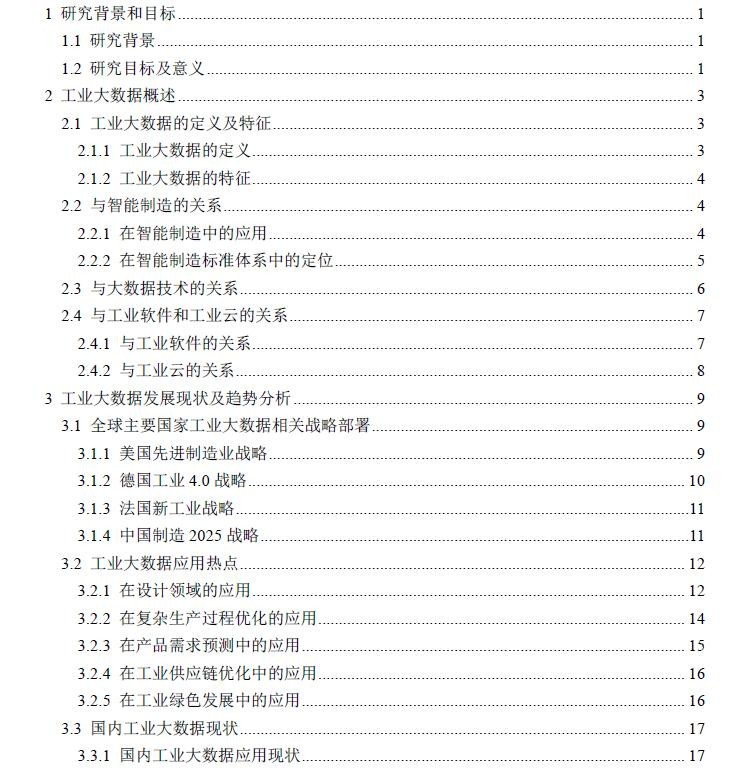 概要《白皮书》分为研究背景和目标、工业大数据概述、工业大数据发展现状和趋势分析、工业大数据参考架构等8个部分。目标在于明确工业大数据的相关技术、应用以及发展路线,从数据架构、技术架构和平台生态架构角度勾画出工业大数据的整体轮廓,合理制定工业大数据的发展规划和建设路线,明确工业大数据落地推进工作重点,加快促进工业大数据在制造业中的落地应用。