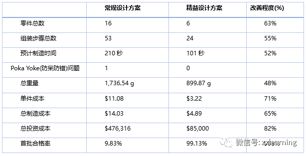 表1是另一个经典案例,美国Munro公司为某整车企业设计的电池托盘,通过利用精益设计方法,从设计端大幅降低产品复杂程度,使得各项生产相关指标大幅度提升。