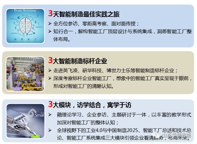华制智能工业4.0标杆企业考察之旅,采用参访与教学相结合的模式,寓学于访,学员可以现学现用,现用现改进,知识直接转化为技能,培训效果立竿见影。这种“知行合一”的标杆企业考察学习,让智能制造更加落地,零距离与智能工厂接触,洞悉智能工厂顶层设计与系统集成,快速了解智能工厂的整体布局。
