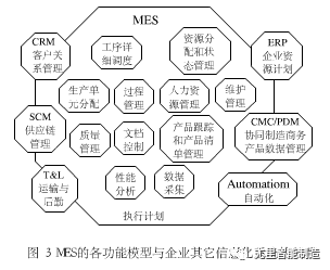 MES的各功能模型与企业其它信息化系统的关系如图三所示。实际的MES产品可能同时包含了其中一个或几个功能模块。