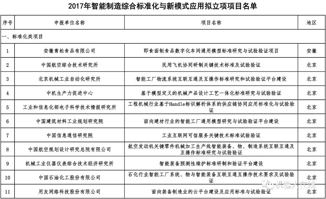 6月7日,工信部发布了“2017年智能制造综合标准化与新模式应用拟立项项目公示”,根据《工业和信息化部办公厅 财政部办公厅关于发布2017年工业转型升级(中国制造2025)资金工作指南的通知》,拟选入165个项目进行公示。与“2016年智能制造综合标准化与新模式应用项目的公示”相比,今年的项目增长了21个。