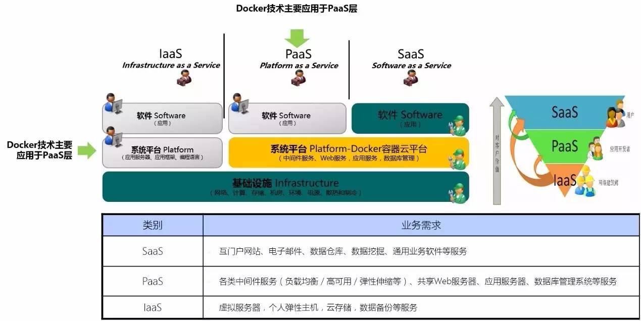 行业的转型和高速发展,意味着各项指标的效率提升,我们讲云计算平台,分为三个层面,即大家所熟知的SaaS、PaaS和IaaS。每个平台所承载的业务需求和价值是不同的,大体如图所示:
