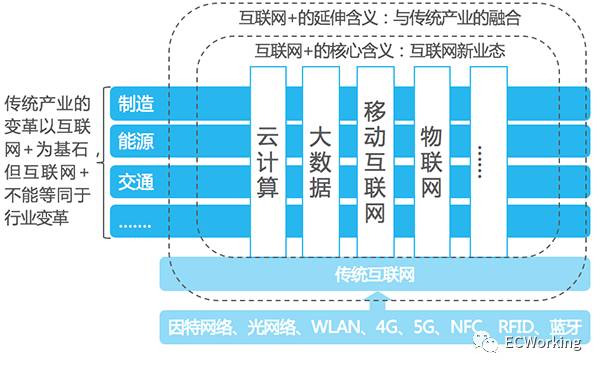 互联网+的延伸含义是:促进传统互联网,以及云计算、大数据、物联网、移动互联网为代表的互联网新业态与传统行业的融合发展,把互联网新业态的基因融合到传统产业的基因中去,以期引发产业领域的全新变革。