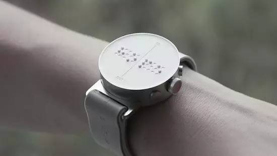 韩国初创公司经过三年专心研发的 Dot 盲人智能腕表将在本月正式上市。这款腕表的表盘部分为一块动态的盲文显示区,当腕表接收到通过蓝牙与之相连的智能手机上的信息后,便会在表盘上立即显示出对应的盲文,每次4个盲文字符,阅读后继续显示下一组。显示速度可以自行根据需要进行调整。
