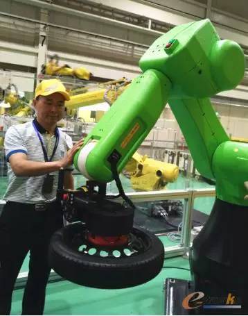考察团参观了FANUC的产品展示中心,这里展示的产品琳琅满目。其中,能够举起一辆汽车的M-2000iA大型装配机器人引起大家浓厚兴趣;协同作业机器人是FANUC产品中唯一是绿色,而不是黄色的产品,这种机器人具有引导示教功能,进入引导示教模式之后,可以由操作人员引导机器人进行运动,记录了运动轨迹之后,机器人就可以完成示教的运动,考察团成员饶有兴趣地体验了一下由协同作业机器人完成给汽车后箱安装备胎的工作;另一个吸引大家眼球的,是FANUC的拳头机器人,这种机器人集成了视觉传感器,可以自动识别药片的颜色和位置,高速、准确地装瓶;FANUC加工中心的性能也十分抢眼,大进给量,快速切除余量,可以实现高速、高精密加工。
