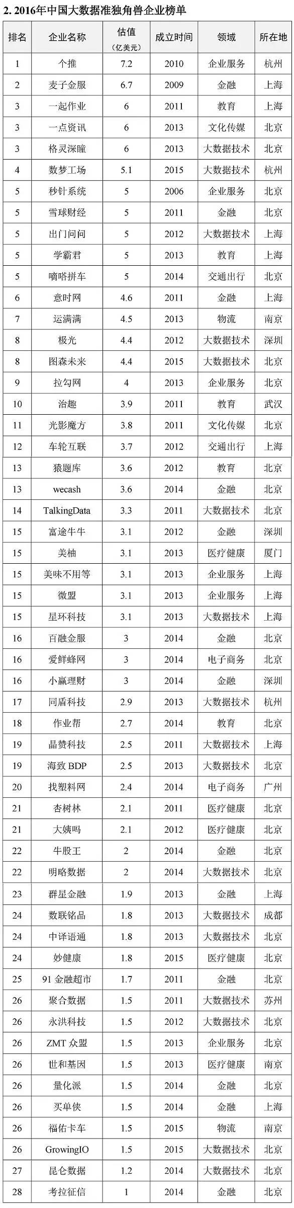 在《报告》公布的“2016年中国大数据独角兽企业榜单”和“2016年中国大数据准独角兽企业榜单”中,共有83家企业入选。这些企业的总估值达到2284.2亿美元,平均估值为27.5亿美元,分布在10个行业。其中达到独角兽企业标准的企业一共29家。