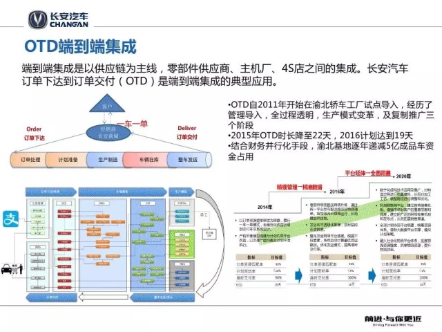 OTD自2011年开始在渝北轿车工厂试点导入,经历了管理导入,全过程透明,生产模式变革,及复制推广三个阶段。2015年OTD时长降至22天,2016计划达到19天,结合财务并行化手段,渝北基地逐年递减5亿成品车资金占用,由此可见这给企业带来的经济价值是巨大的。